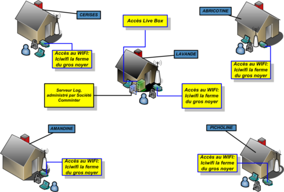 Un propriétaire dans le Vaucluse, à souhaité distribuer internet entre 5 villas distantes qui sont louées pendant les vacances. Une villa équipée d'une LiveBox, partage l'A.D.S.L. avec 4 autres villas distantes de 50 à 250 mètres de la villa principale.
